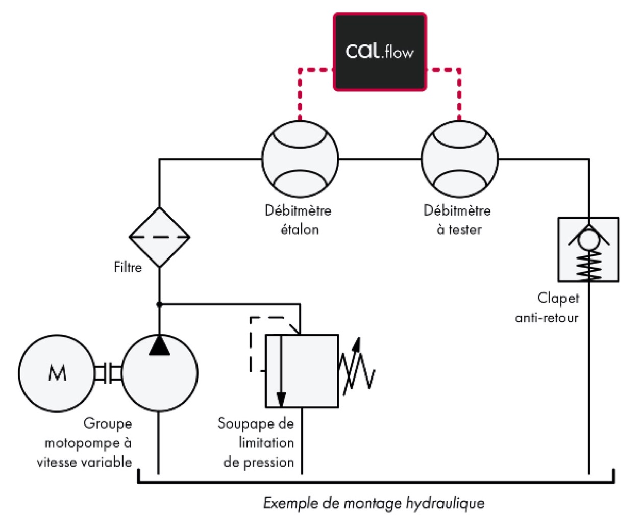- Principe de référence : Cal.flow utilise un montage hydraulique en série, comparant les valeurs fréquentielles d'un appareil de référence et de l'appareil à tester pour une précision optimale.