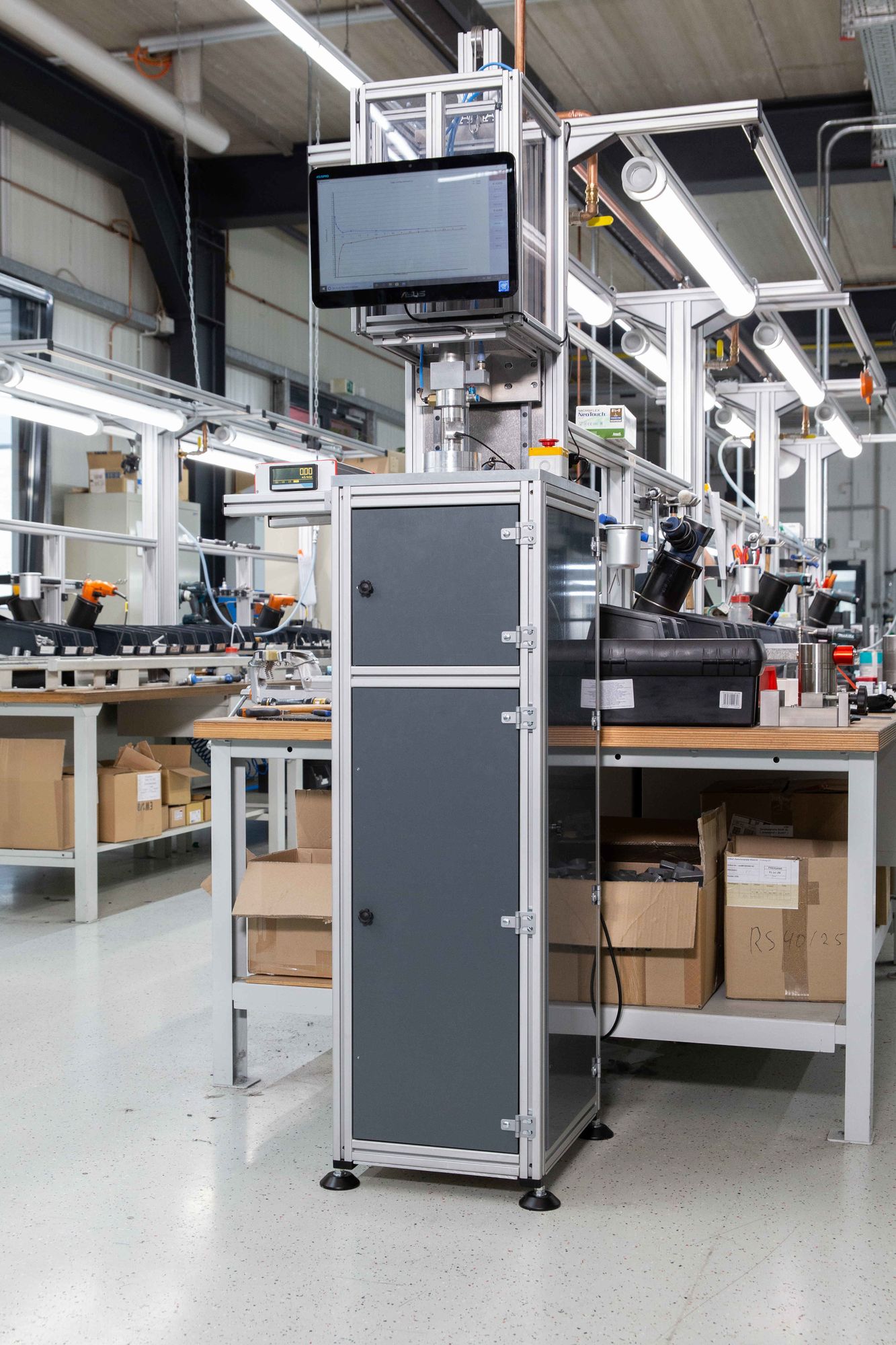 Le nouveau banc d'essai est basé sur la méthode éprouvée de la mesure par piston-étalon. Un vérin linéaire à commande électronique envoie le fluide à travers le RS, pour en ressortir vers un autre vérin de récupération. Le vérin linéaire peut être positionné avec une très grande précision, ce qui permet de contrôler très exactement la cinématique du piston et donc la quantité de fluide déplacé. Le fluide peut être pré-pressurisé ou dégazé (libéré des bulles d'air), afin d'éliminer toute erreur de mesure. Le nombre d'impulsions délivré par le signal de sortie du RS est enregistré et comparé au volume réel déplacé, afin de calculer le facteur K du débitmètre. Un logiciel contrôle toute la procédure d'étalonnage et peut être programmé avec des valeurs de débit et de volume prédéfinies.